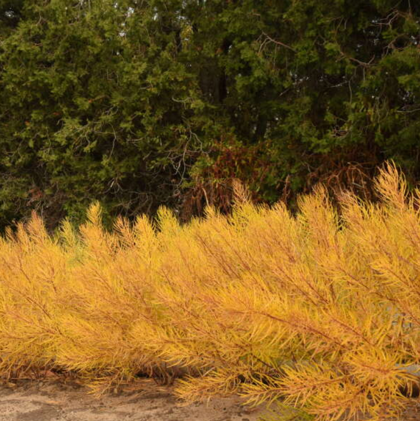 A compact, North American native perennial featuring delicate, light periwinkle-blue flowers that rise above fine, thread-like dark green foliage in late spring. In fall, the foliage transforms to a brilliant golden-orange, adding seasonal interest. Heat- and humidity-tolerant, deer resistant, and low-maintenance, making it ideal for rain gardens, prairie gardens, or mixed borders.