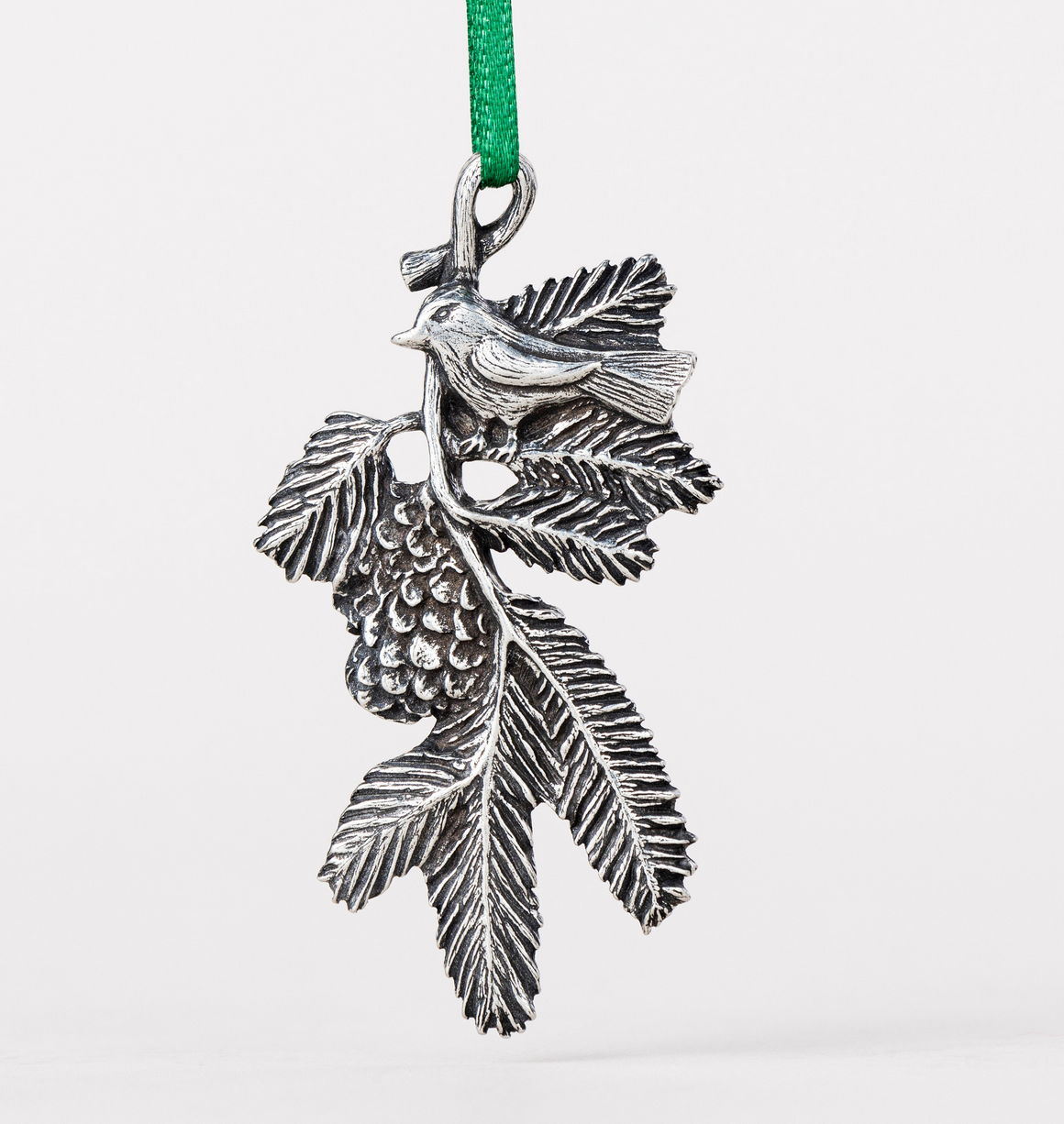 Danforth's handcrafted Bird on a Bough Ornament is a sweet portrayal of a bird perched gracefully on a pine branch.