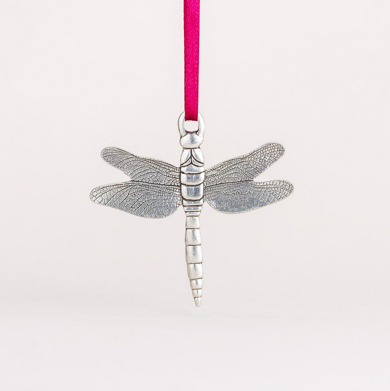 The Dragonfly pewter ornament is detailed on both sides and comes in a flannel pouch and gift box. It measures 2 1/8" wide by 2" high, plus the satin ribbon.