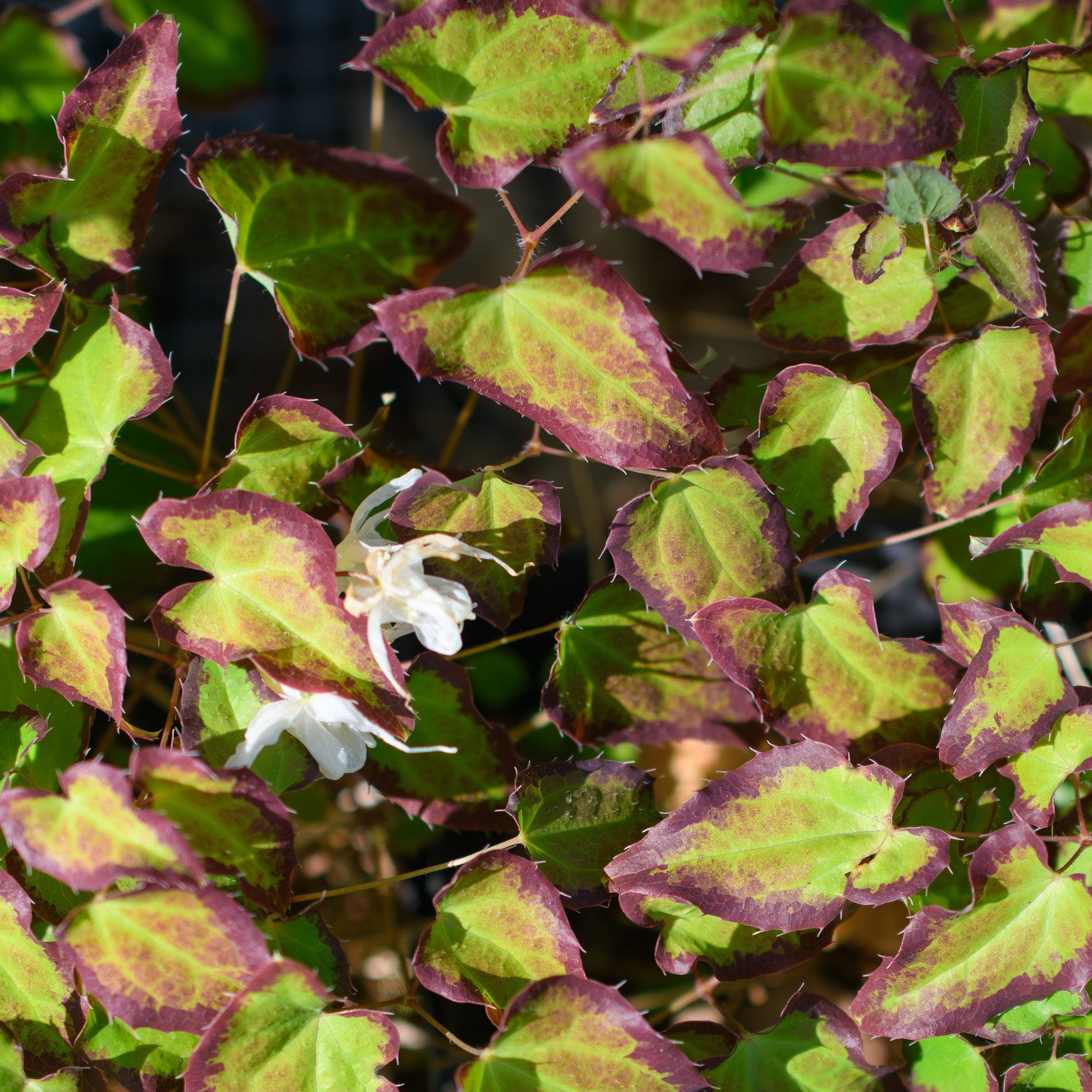 ‘Bandit’ features delicate green leaves edged with a striking ½" “hand-painted” border of dark burgundy-purple. Clusters of white flowers bloom in spring, creating a charming contrast against its colorful foliage. Perfect for shaded borders, woodland gardens, or as a ground cover.