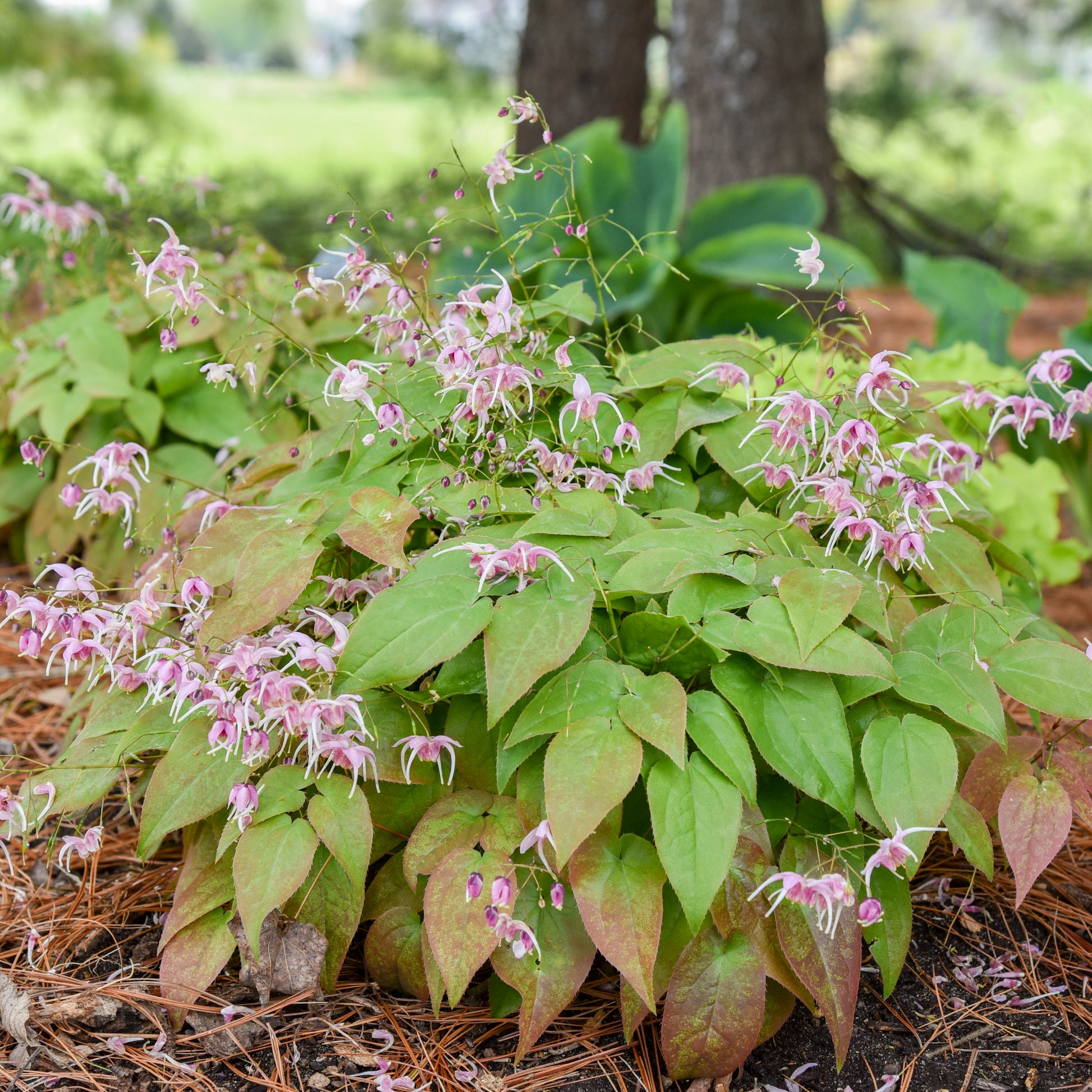 ‘Pretty in Pink’ is a charming Epimedium with whimsical, jester hat–like flowers. Each bloom features white spurs, rose-pink backs, and deeper rose centers for a layered, colorful effect. Its small, heart-shaped leaves are bright green in spring and take on dramatic bronze tones reminiscent of autumn maple leaves. A striking shade perennial with multi-season appeal.