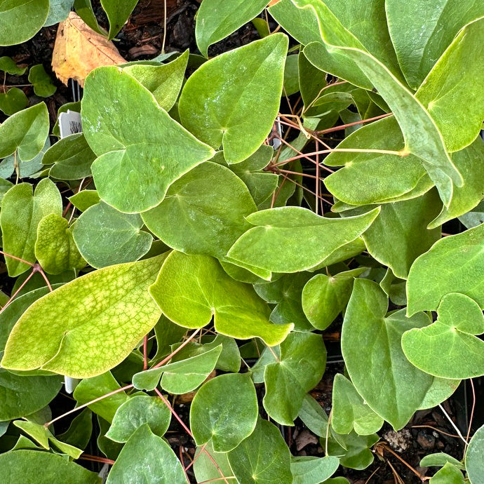 Foliage emerges in spring deep chocolate brown, gradually warming through vibrant red tones before fading at the edges to green in tidy mounds of elongated, heart-shaped leaflets. Spring flowers feature light lavender sepals with a lighter cup. Excellent as a ground cover or in woodland gardens. Drought tolerant once established and adaptable to various soil conditions. Deer resistant.