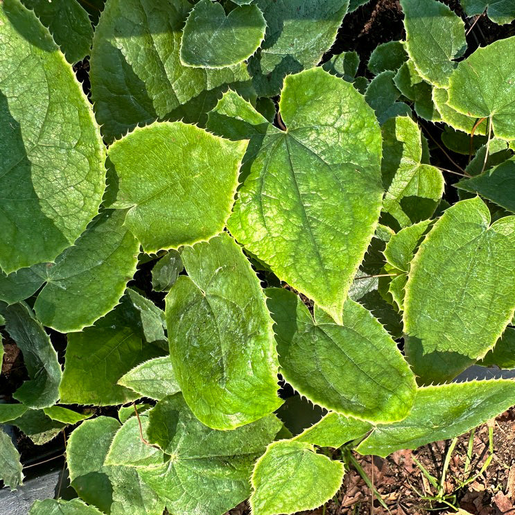 A large species featuring bright yellow flowers and large evergreen leaves that take on an orange-salmon hue in spring. For best foliage display, cut back old leaves in spring before new growth appears. Excellent as a ground cover or in woodland gardens. Drought tolerant once established and adapts to various soil conditions. Deer resistant.