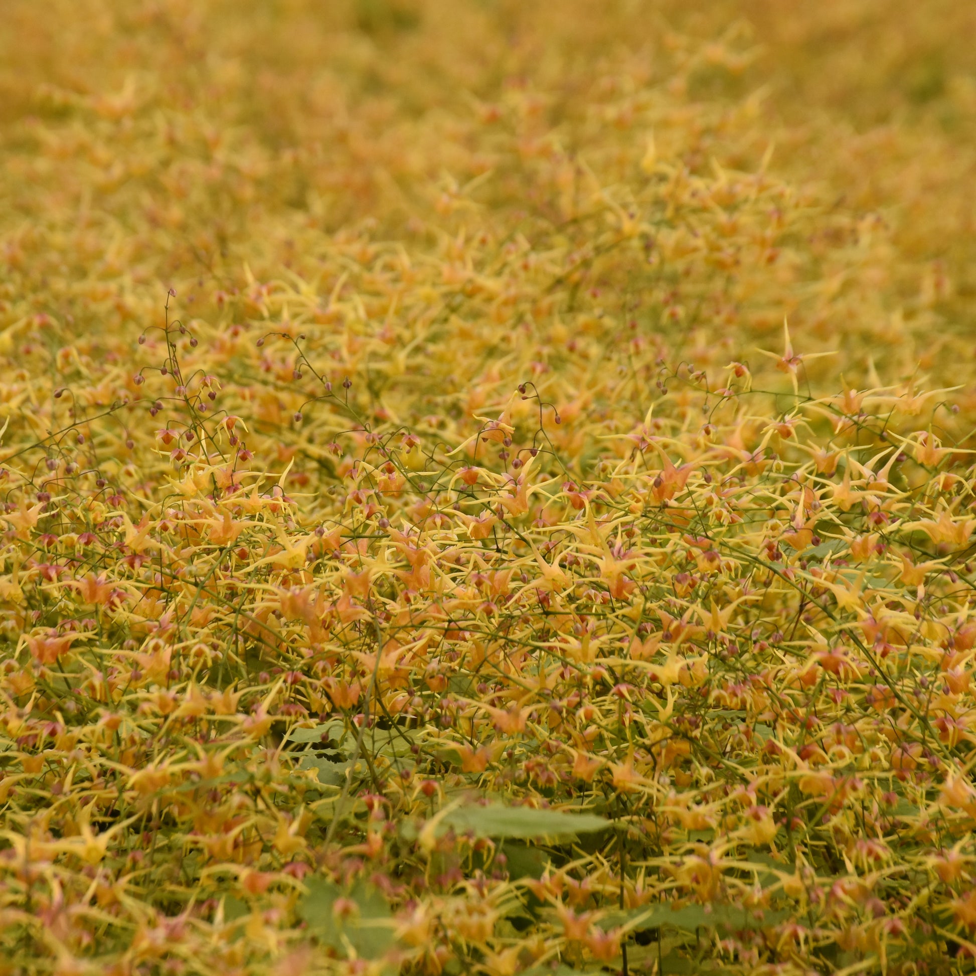 ‘Songbirds’ is one of the most floriferous Epimedium selections, producing long, striking inflorescences of golden-yellow flowers with small rose sepals in late spring. Its deep green, lance-shaped leaves feature subtle spotting, adding texture and interest. This variety blooms later than most, extending the season and brightening dry shade gardens.