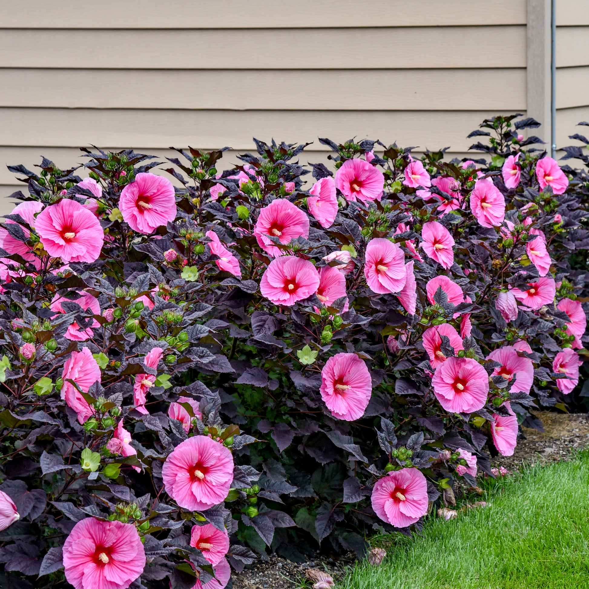 At only 3-3½' tall, this is our most compact Hibiscus to date. 7-8" bubblegum pink flowers have overlapping petals and darker pink veining for a dramatic 3D effect. Jet black foliage is the darkest we've seen on a Hibiscus and contrasts nicely with the green flower calyxes and red veining and petioles. Compared to 'Evening Rose', this has darker foliage, a more compact habit, and brighter pink flowers. Best color and performance will be in full sun.
