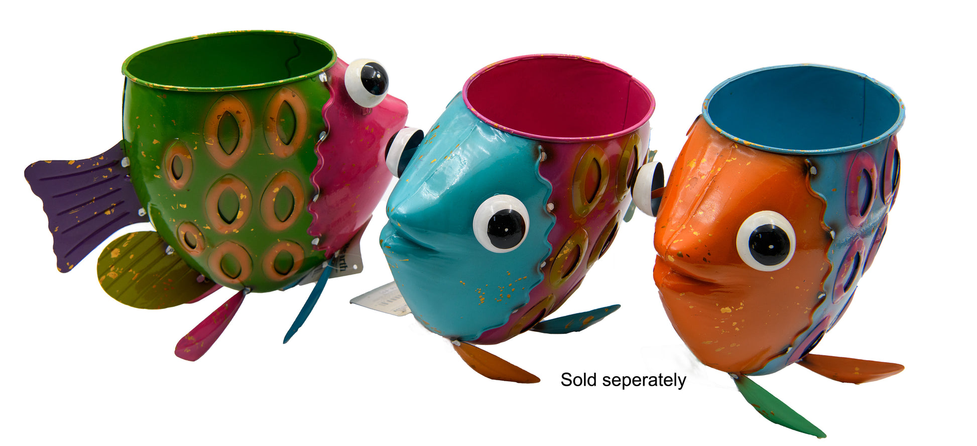 These delightful Metal Fish Planters (sold separately) can go indoors or out to add whimsical fun to any space. Group them together or use them in different areas inside or outdoors. They add a cheerful splash of color anywhere!