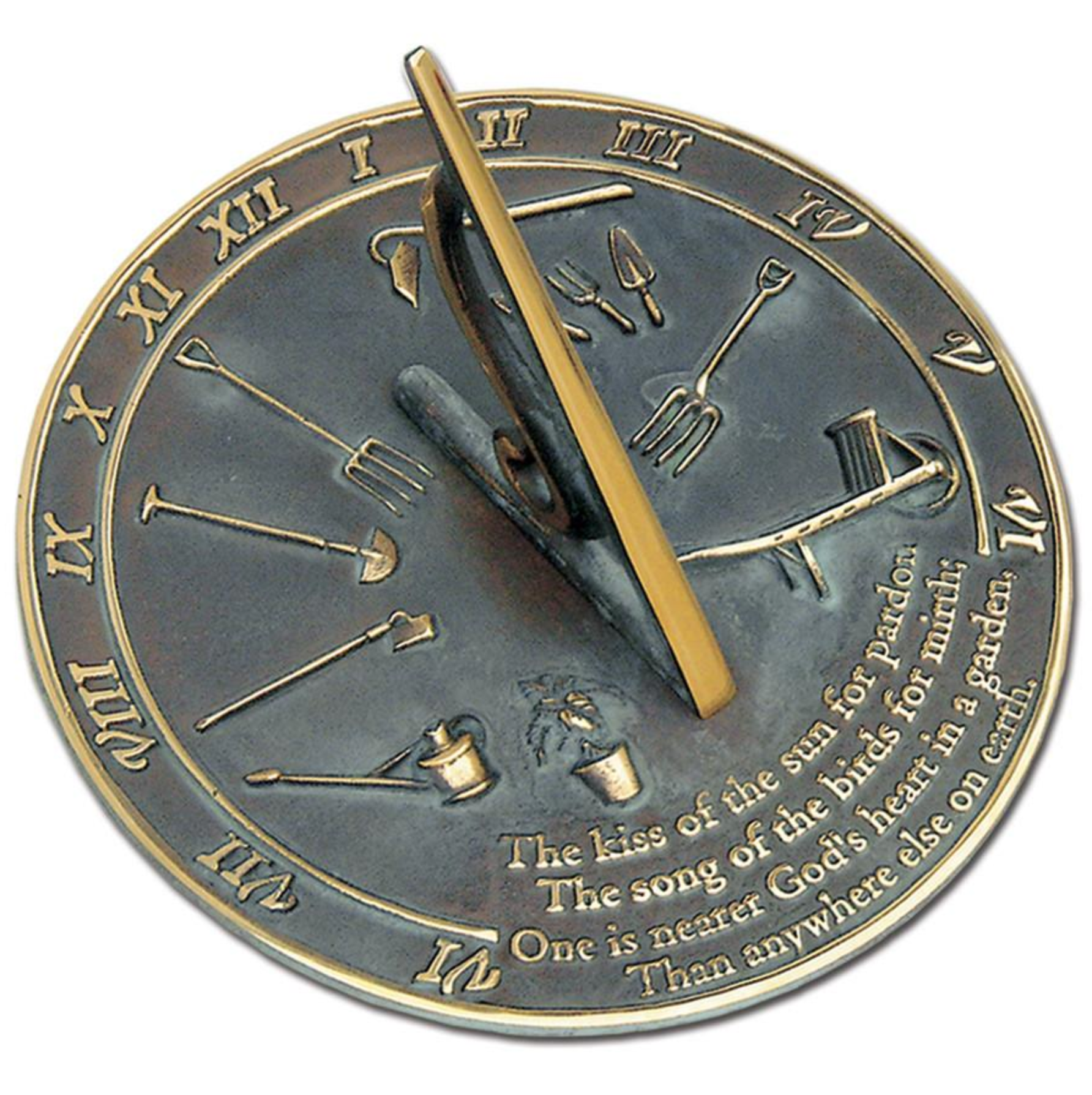 This 10" brass dial is inscribed with Dorothy Frances Gurney’s cherished poem, “The kiss of the sun for pardon, the song of the birds for mirth, One is nearer God’s heart in a garden than anywhere else on earth.” A fitting sundial for the gardener. Handcast using traditional sand molds. Made from 100% solid brass with two tone finish of antiqued verdigris and polished highlights.