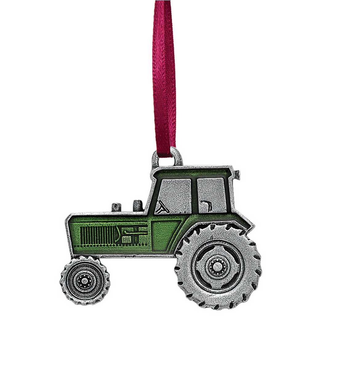 A classic enclosed tractor design with hand applied John Deere green color. The Tractor / Green Ornament measures 1 3/4" wide and 1 1/2" high, is tied with a red satin ribbon, and comes tucked in a flannel pouch for safe keeping. A wonderful ornament for anyone who loves their John Deere.